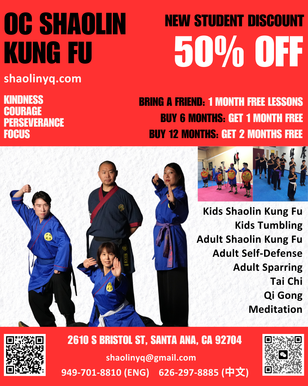 Whether you are interested in taking your first lesson, or you have trained in martial arts for many years, Shifu Shi Yanqing of OC Shaolin Kung Fu is the instructor for you. His temperament, dedication, and ability make his classes an easy recommendation for any skill level and his extensive background in traditional Kung Fu shines through every lesson he gives. He is great with children and adults alike and has an innate ability to inspire students to improve while also enjoying their training. If you have been looking around for a place to practice martial arts for either yourself, or your kids, you cannot go wrong by giving his lesson a shot. There is no better time to try than now!